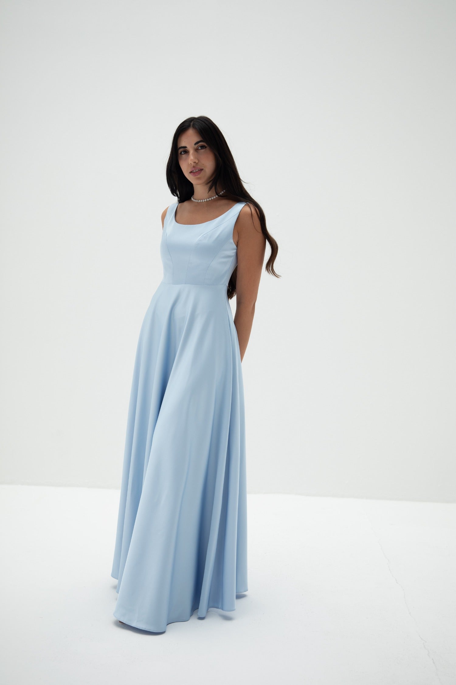 Step into classic elegance with our "blue charm gown". This floor-length dress features a soft, flowing silhouette, with a flattering scoop neckline and subtle seams that enhance the feminine shape. The sleeveless design and clean lines make it a versatile choice for both daytime events and evening soirees, while the delicate pastel hue evokes serenity and sophistication.