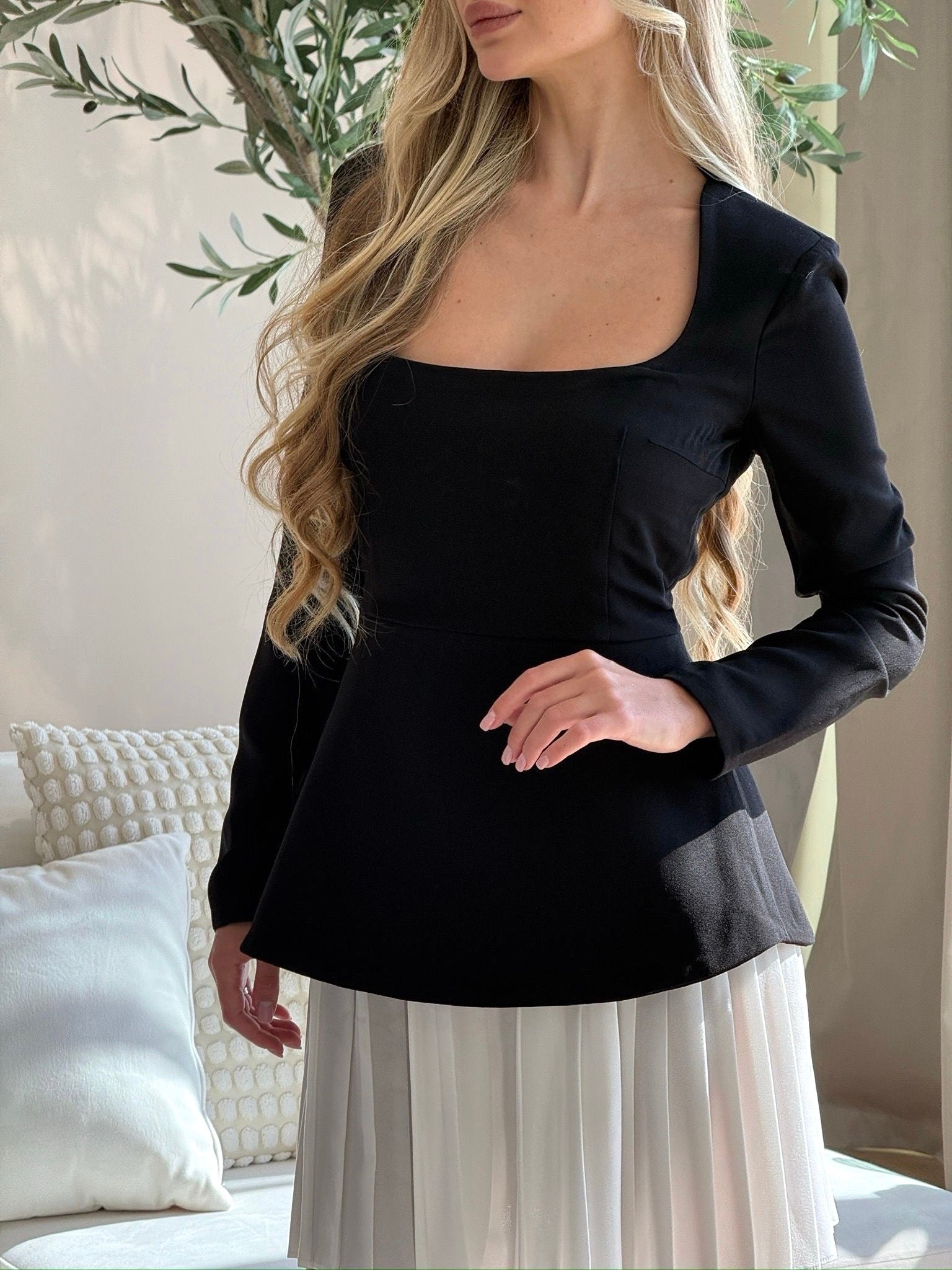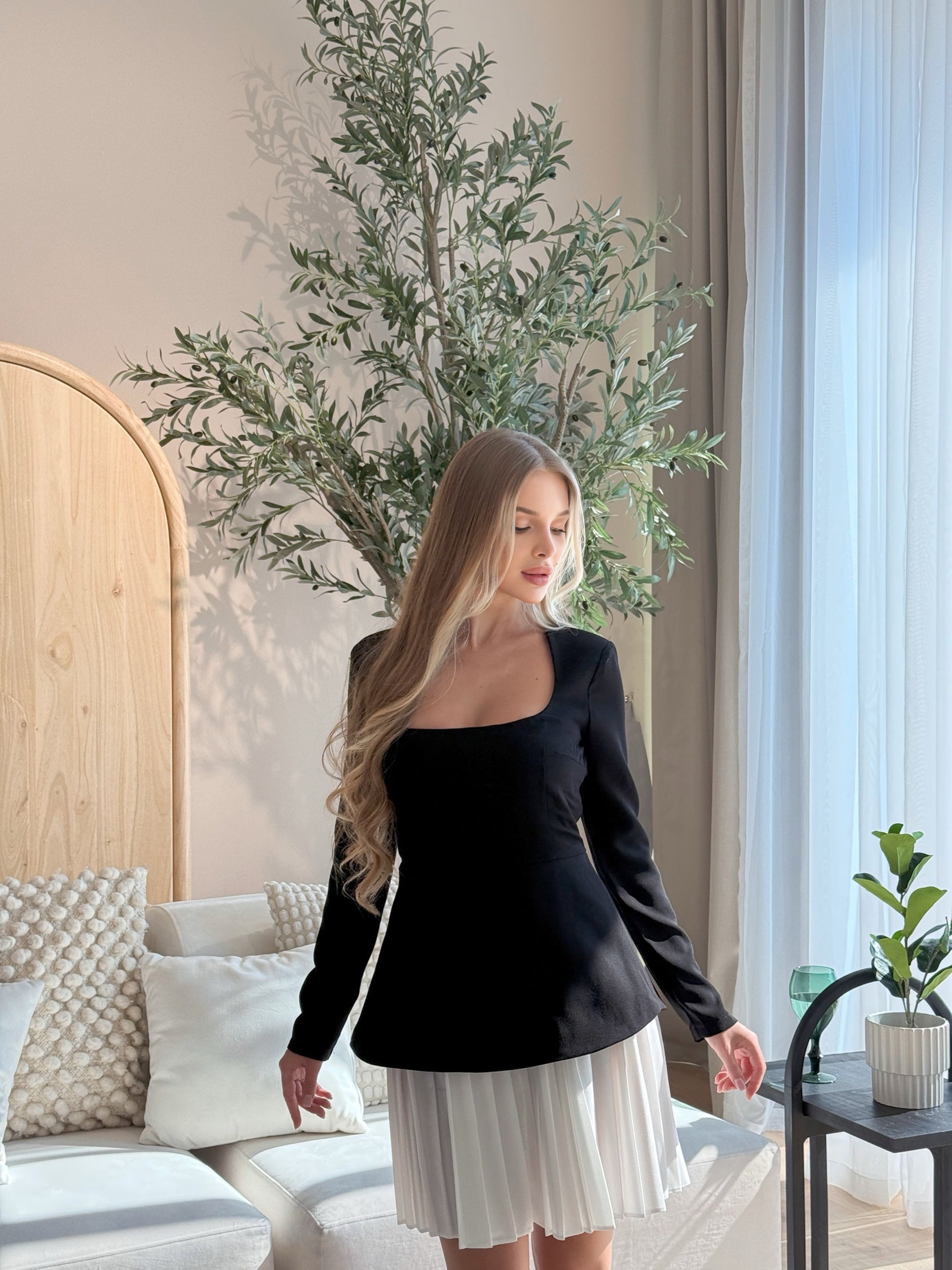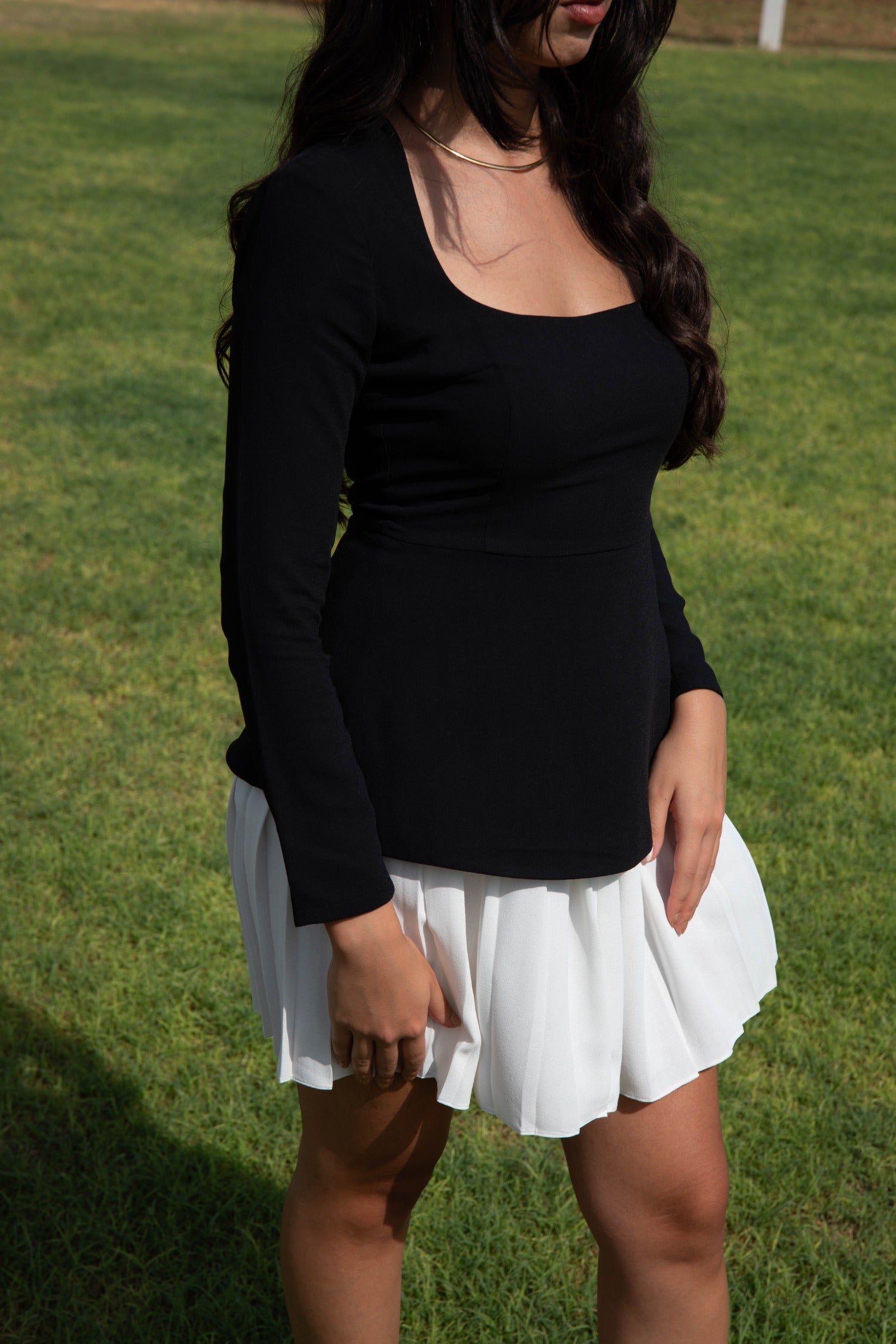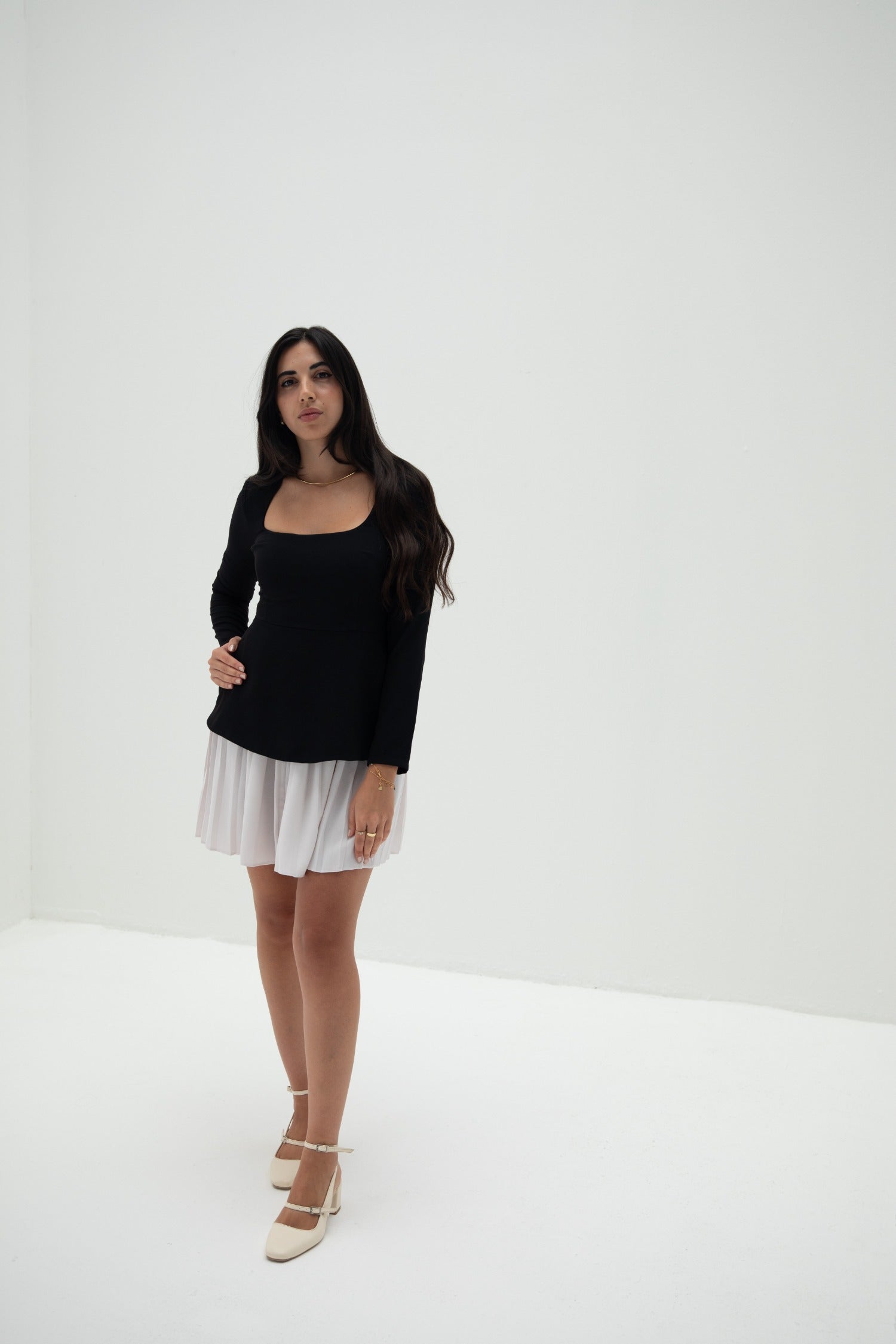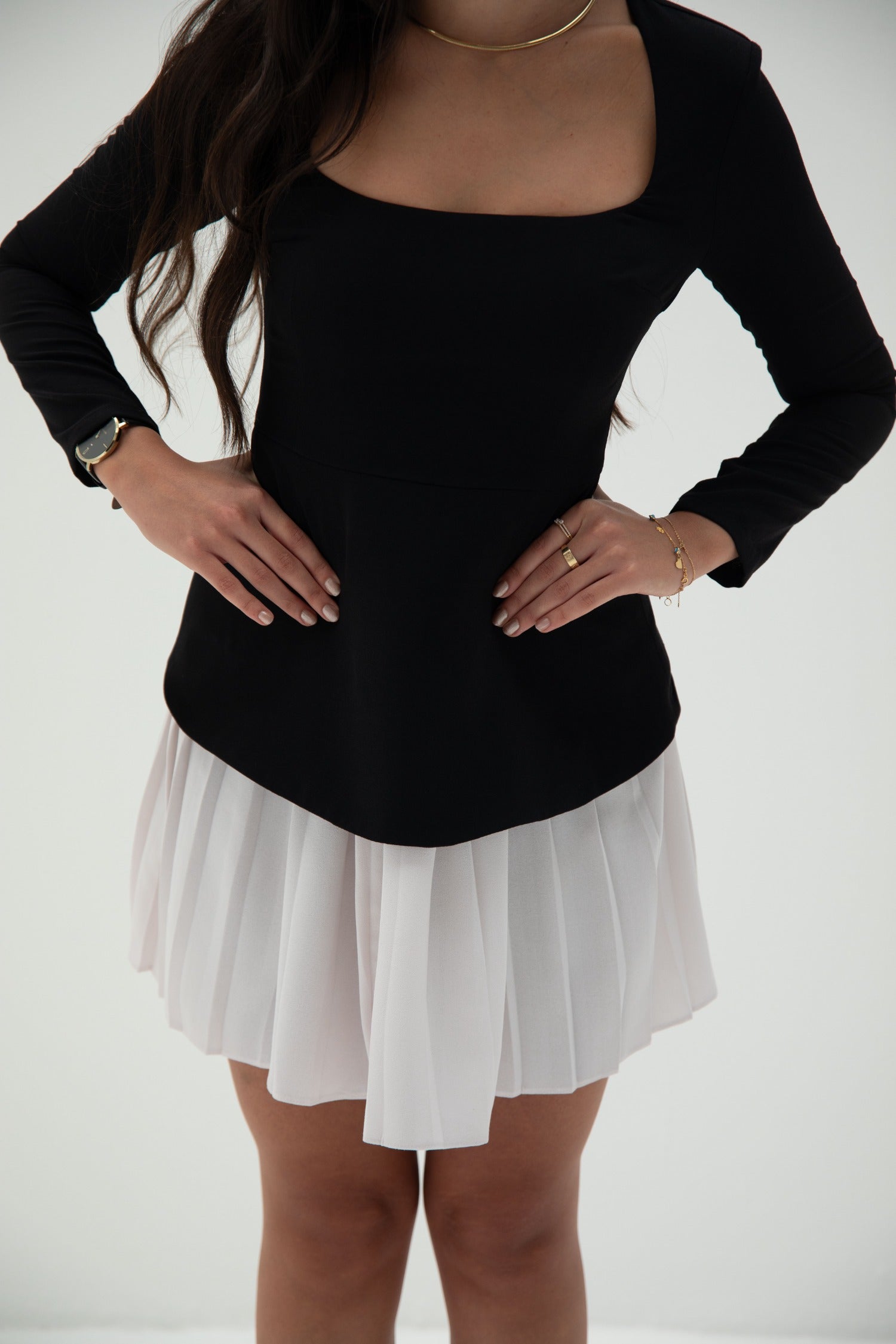 "The Noir Fleur Dress blends structured sophistication with playful elegance. Featuring a fitted black bodice with a square neckline and long sleeves, it’s paired with a crisp white pleated skirt for a feminine touch. Perfect for day or evening, its tailored silhouette and timeless palette flatter effortlessly."
